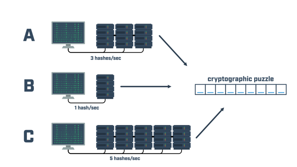 The more computational power a miner allocates, the better chance they have at solving the cryptographic puzzle