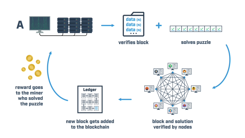 Proof of Work (POW) is the main consensus algorithm (the way in which a blockchain reaches agreement) used by blockchains today including Bitcoin. It's main purpose is to keep the network secure by regulating how blocks are added to a blockchain , new coins are generated, and miners (nodes that compete to add a block to a blockchain) are rewarded. For a miner to receive a reward, they need to put in work (measured by computational power in hashes/sec) in order to solve a cryptographic puzzle before others to get the opportunity to add a block to the blockchain. The more resources they allocate, the higher chance they have of solving the puzzle since the only way to solve it is by brute force (plugging in every possible answer and hoping it works). This method is decentralized because instead of a central entity verifying these transactions and releasing coins, this power is distributed amongst miners. This decentralization also comes into play when voting on a blockchain’s governance because instead of casting votes per user, votes are cast based on the amount of resources.